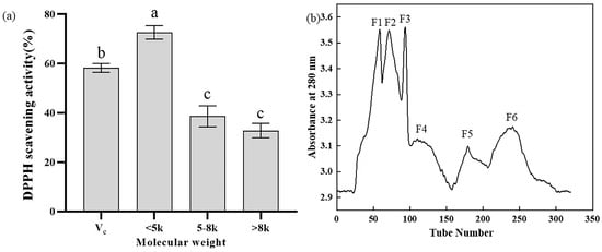Ultrafiltration was employed to fractionate the Y-1 hydrolysate into three molecular weight fractions: >8 kDa, 5−8 kDa, and <5 kDa. As depicted in Figure 1, bioactive peptides of varying molecular weights exhibited distinct effects on DPPH radical scavenging activity (Figure 1a). Notably, the <5 kDa fraction of the mussel hydrolysate demonstrated a DPPH scavenging rate exceeding 70%, outperforming both higher molecular weight fractions and 10 mg/mLVC, which underscores its optimal antioxidant activity. To further isolate the most active components, a Sephadex G-25 chromatographic column (100 cm × 1.6 cm) was used to fractionate the <5 kDa peptide fraction. This separation yielded six distinct absorption peaks (Figure 1b), and the eluates corresponding to each peak were collected and freeze-dried for subsequent analysis.