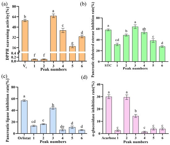 (a) DPPH radical scavenging rate; (b) pancreatic cholesterolase inhibitory activity; (c) pancreatic lipase inhibitory activity; (d) α-glucosidase inhibitory activity. Different lowercases above the error bar suggest obvious differences in antioxidant activity of separated components (p < 0.05).
