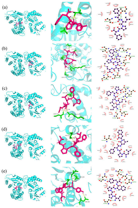 3D and 2D docking diagrams of FLPF (a), FPRIM (b), IMLFP (c), LPFLF (d), and VPPFY (e) with the active site of CD38. The purple part in the figure represents the ligand, the green part represents the residues of the receptor, and the yellow dotted lines represent hydrogen bonds.