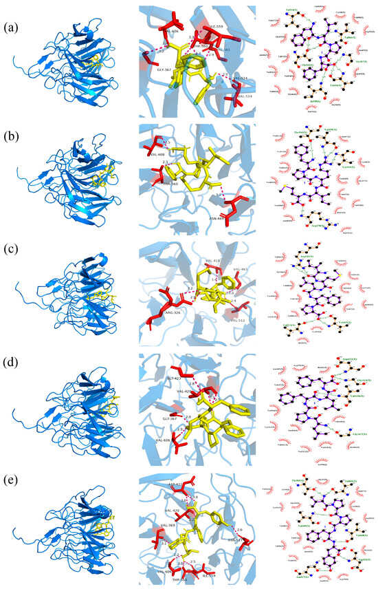 3D and 2D docking diagrams of FLPF (a), FPRIM (b), IMLFP (c), LPFLF (d), and VPPFY (e) with the active site of Keap1. The yellow part in the figure represents the ligand, the red part represents the residues of the receptor, and the purple dotted lines represent hydrogen bonds.