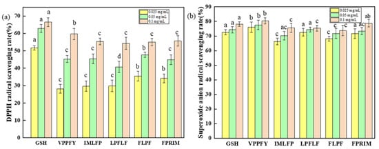 (a) DPPH radical scavenging activity of synthetic polypeptides; (b) superoxide anion scavenging activity of synthetic polypeptides. Different lowercases above the error bar suggest obvious differences in antioxidant activity of separated components (p < 0.05).