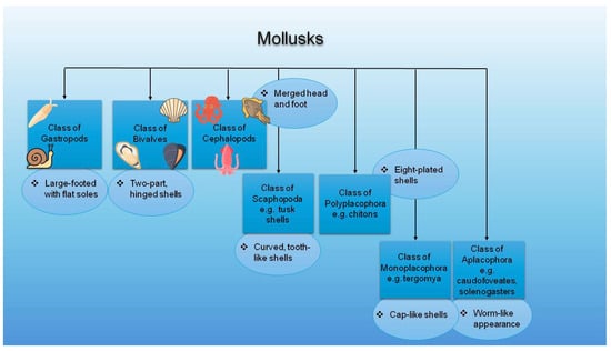 Classification of mollusks with examples (Figure designed with https://www.canva.com/ (accessed on 3 June 2025), and parts of this figure were obtained via https://www.flaticon.com/ (accessed on 3 June 2025)).