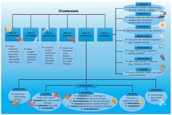 Classification of crustaceans with examples (Figure designed with https://www.canva.com/ (accessed on 20 June 2025) and parts of this figure were obtained via https://www.flaticon.com/ (accessed on 20 June 2025)).
