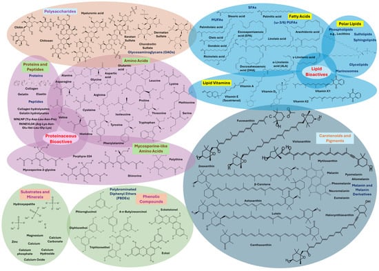 Marine by-products such as fish heads, skins, bones, viscera, crustacean shells, and mollusk tissues are abundant in valuable bioactive compounds, like polysaccharides (e.g., chitin, chitosan, and their derivatives, hyaluronic acid, GAGs, and fucoidans), fatty acids (e.g., SFAs, MUFAs, and mainly PUFAs like LA, DHA, EPA, ALA, or arachidonic acid), lipid bioactives and polar lipids (e.g., lecithin, phospholipids, glycolipids, sphingolipids, sulfolipids, or marinosomes), lipid vitamins (e.g., A, B, D, E, or K), amino acids (all 20 standard residues and mostly MAAs), proteins (e.g., collagen, elastin, gelatin), peptides (small amino acid chains, collagen- and gelatin-hydrolysates), carotenoids and pigments (e.g., astaxanthin, melanins like allomelanin, neuromelanin, eumelanin, pheomelanin, and pyomelanin, lutein, β-carotene, halocynthiaxanthin, and fucoxanthin), phenolic compounds (e.g., polyphenols, PBDEs, phlorotannins like diphlorethol, triphloroethol, trifuhalol, and tetrafuhalol, phloroglucinol, eckol, and eckstolonol), substrates and minerals (e.g., hydroxyapatite, CaPs, minerals like Ca, Mg, and Zn, and powdered pearl shells or nacreous shell layers). These compounds exhibit a broad spectrum of biological activities, such as antioxidant, anti-inflammatory, antimicrobial, anti-aging, moisturizing, and UV-protective properties, making them ideal for cosmetic use. Their extraction not only supports the development of functional skincare products but also contributes to environmental sustainability by promoting the circular use of marine resources [,,,]. Figure 3 illustrates the bioactives in marine bycatch and by-products.