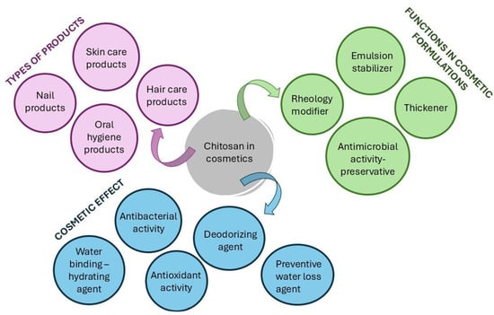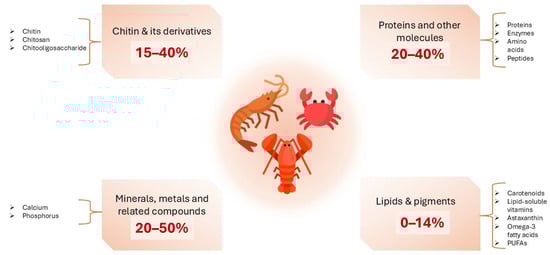 Crustacean shells are composed of chitin (15–40%), protein (20–40%), calcium carbonate (20–50%), and lipids (0–14%) along with high concentrations of ω-3 fatty acids, pigments, and other minor components. The composition may vary depending on season and species [,,]. These components have demonstrated a wide range of uses. For example, calcium carbonate can be applied as fertilizer, filler, or white pigment, whereas proteins can be utilized as animal feed or fertilizer []. Chitin, on the other hand, has versatile applications, ranging from water treatment to biomaterials, functional food, medicine, and cosmetics (Figure 4) [,].