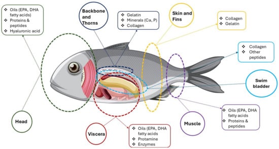 Fish are a rich source of high-quality protein and are consumed either in fresh or processed form. The skin, bones, scales, heads, and viscera are among the various components of the marine biomass that account for approximately 50 to 70% of total fish weight and are typically discarded during processing. These components are regarded as secondary raw materials with high valorization potential. Bioactive compounds obtained from fish and their by-products can be used in various industries, including food, agriculture, cosmetics, nutraceuticals, and pharmaceuticals [].