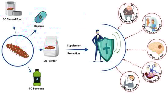 Potential neuroprotective applications of sea cucumber-based products. SC, sea cucumber. The figure was generated from the concept of Man et al. (2022) [45] using Biorender.com (Agreement number: FF28KHIJ6E).