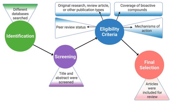 The article selection process was based on important criteria, for example, the peer review status, the type of publication, including original research, review article, or other publication types, the coverage of bioactive compounds extracted from the target organism, and the effects as well as the mechanisms of action of the compounds in the body. Following that, the selected articles were further assessed based on the study objectives, appropriateness of the methods, accuracy of the data analysis, and effectiveness of the findings [49]. In order to increase the credibility and coherence of the results by finding parallels and differences among studies, a meticulous cross-referencing and validation process was employed, and studies with inconsistent results or a poor methodology were omitted (Figure 2).