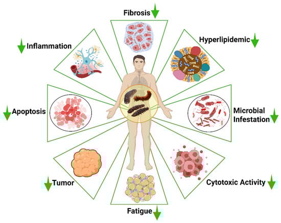 Among different valuable marine resources, sea cucumbers are one of the most promising ones, belonging to the class Holothuroidea. These organisms are soft-bodied marine invertebrates with leathery skin and an elongated shape with a single, branched gonad. There are 1716 species of sea cucumbers, with the Asia–Pacific region having the highest biodiversity [27]. Due to the exposure to the challenging and dynamic environment, sea cucumbers have evolved to produce distinct secondary metabolites with biological activity [28]. Sea cucumbers have been used for their medicinal properties since ancient times. According to the Ming dynasty account (1368–1644), sea cucumbers were known as “haishen,” or “ocean ginseng,” since they had the same medical qualities as ginseng [28]. Within the framework of Traditional Chinese Medicine, sea cucumbers have been utilized as a revitalizing agent to treat skeletal and joint weakness, especially that associated with age-related inflexibility, renal system abnormalities, sexual disorders, dry-stool constipation, poor lipid digestion, and circulatory complications [29].