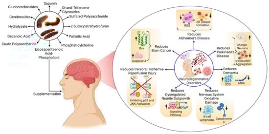 The bioactive compounds from different sea cucumbers have shown positive results in combating NDs such as AD, PD, brain cancer, brain tumors, and other disorders. In treating AD, these compounds reduce ROS, which causes inflammation in the brain, and inhibit the formation of Aβ plaque, which is the main reason behind AD. These compounds also reduce the aggregation of alpha-synuclein (α-Syn), resulting in the improvement in the PD condition. Apart from these two important disorders, these compounds also play a role in treating brain cancer, reducing cerebral ischemia–reperfusion injury, dysregulating neurite outgrowth, and oxidative damage by modulating different signaling pathways or gene expression (Figure 4).