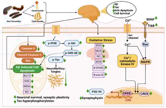 In a study by Li et al. (2019), the positive neuroprotective effect of sea cucumber-derived cerebrosides was studied in which levels of BDNF, p-CERB, and PSD95 were increased from approximately 1 to 1.2 folds, 1 to a 1.5 folds, and 1 to 1.1 folds, respectively, indicating enhanced neuronal survival, transcriptional activity, and synaptic integrity [35]. In the same study, the content of p-PI3K and p-Akt was found to upregulate from 1 to 1.1 folds to 1 to 1.25 folds, respectively. It was suggested that cerebrosides suppressed the phosphorylation of the tau protein by the PI3K/Akt/GSK3β pathway.