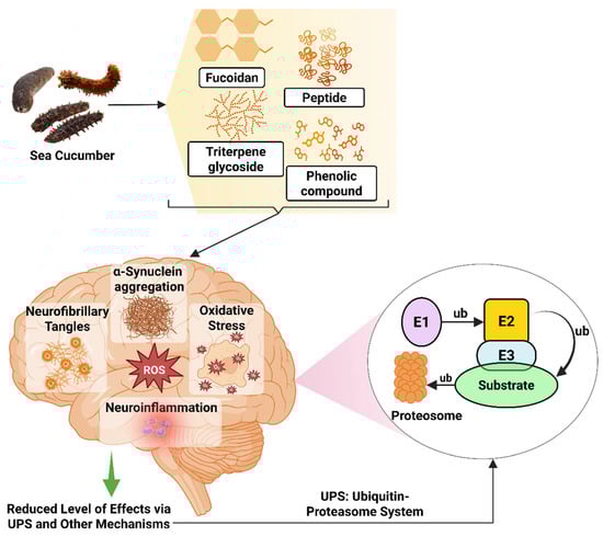 Different bioactive compounds from sea cucumber, such as extracts of H. leucospilota, H. scabra, C. elegans model, and S. japonicus, are being studied for treating PD [65,262,286]; however, the neuroprotective mechanism is yet to be discovered. According to Malaiwong et al. (2019), activation of the ubiquitin-proteasome system (UPS) is one of the mechanisms behind the success of H. leucospilota extract in having anti-Parkinson effects [65]. Ubiquitin in the UPS is a 76-amino-acid conserved protein that plays a role in controlling and assisting the protein denaturation process [287]. The ubiquitin binds with the targeted protein and, via catalytic reactions, breaks down the protein. For this reaction, three types of enzymes, such as E1 (ubiquitin-activating enzyme), E2 (ubiquitin-conjugating enzyme), and E3 (ubiquitin–protein ligase), are used [288,289]. Toxic intracellular proteins can accumulate due to abnormal protein stability, resulting in hampering neural homeostasis. Accumulation of the aggregated and misfolded brain protein, α-synuclein, is one of the main reasons behind PD-linked mutations of the α-synuclein gene, which can interfere with different cellular and molecular functions, thus inducing neurotoxicity [290].