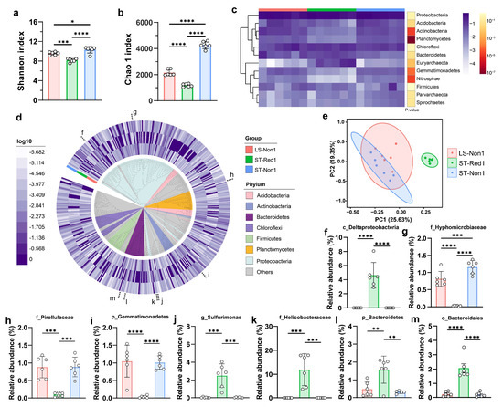 (a) Shannon index and (b) Chao 1 index of the microbial community in the reductive sediment and two non-reductive sediments from the South China Sea cold seep. (c) Microbial composition at the phylum level in the three sampling locations. (d) Phylogenetic tree of the 485 OTUs with total abundance > 100. The data are represented in layers from inner to outer: OTU classification at the phylum level and the relative abundance of OTUs across the three sampling locations. (e) PCA plot of microbial composition grouped by sampling location. (f–m) Eight OTUs showing significant inter-group variation. * p < 0.05, ** p < 0.01, *** p < 0.001, and **** p < 0.0001.