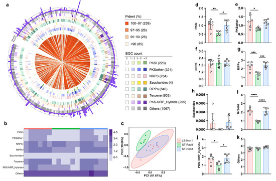 (a) Phylogenetic tree of the 378 bacterial OTUs with a total of ≥5 BGCs. The data are represented in layers from inner to outer: 16S rRNA sequence percent identity relative to the PSMPA database, the distribution of various BGC classes encoded by the OTUs, and the total number of BGCs encoded by each ©. (b) Heatmap illustrating the distribution of different BGC types across the three sampling locations. (c) PCA plot of BGC composition grouped by sampling location. (d–k) Abundance of eight distinct BGC classes across the three sampling locations. * p < 0.05, ** p < 0.01 and *** p < 0.001, and **** p < 0.0001.