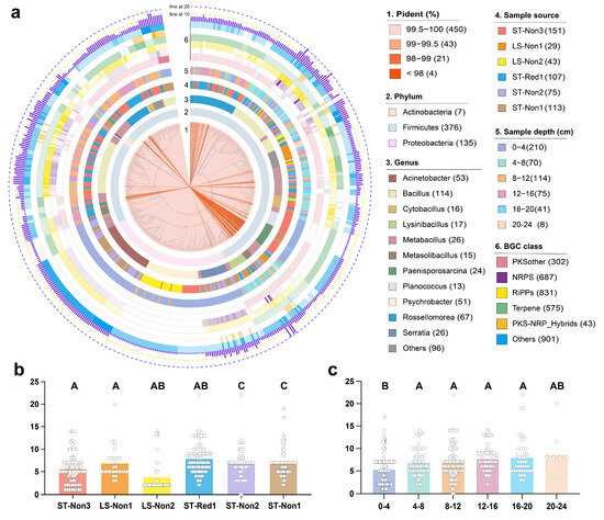 (a) Phylogenetic tree of the 518 isolated bacterial strains. The data are represented in layers from inner to outer: 16S rRNA sequence percent identity relative to the PSMPA database, bacterial taxonomy at the phylum level, bacterial taxonomy at the genus level, isolation sample source, isolation sample depth, and the distribution of various BGC classes encoded by the isolates. Bar charts depict the number of BGCs encoded by isolates from (b) different sample sources and (c) different sample depths. Values with different uppercase letters indicate significant differences (p < 0.01).