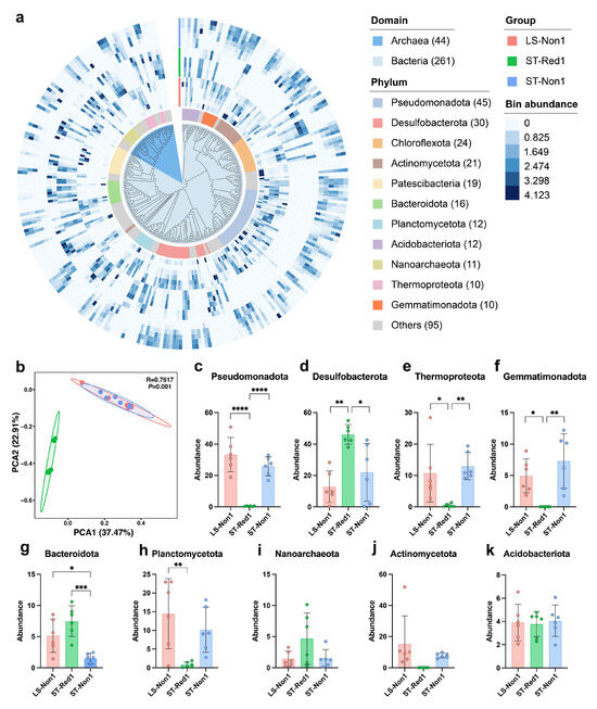 Interestingly, Pseudomonadota were predominantly found in two non-reductive sediments (LS-Non1 and ST-Non1) (Figure 4c), while they were nearly absent in ST-Red1 (ANOVA, p < 0.0001). In contrast, Desulfobacterota, Bacteroidota, and Chloroflexota were more abundant in ST-Red1 (Figure 4a,d) (ANOVA, p < 0.05), whereas other phyla, such as Thermoproteota, Gemmatimonadota, Planctomycetota, and Actinomycetota were predominantly detected in LS-Non1 and ST-Non1 (Figure 4e–k) (ANOVA, p < 0.05). This pattern underscores significant site-specific differences in microbial composition within cold seep environments. Notably, the cold seep site ST-Red1 is characterized by reduced sediments and elevated hydrogen sulfide (H2S) concentrations. These high H2S levels are likely attributable to the dominant Desulfobacterota strains present in the samples.