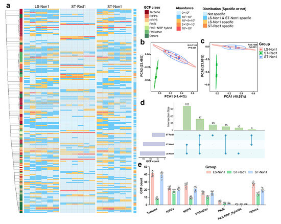 A total of 928 BGCs were identified from the 305 MAGs using antiSMASH (v7.0.0), with lengths ranging from 1 kb to 52 kb (Tables S7 and S8). These BGCs were classified into seven of the eight BiG-SCAPE classes: NRPS (n = 387), terpenes (n = 144), RiPPs (n = 128), other PKSs (n = 76), type I PKSs (n = 43), PKS-NRPS hybrids (n = 2), and others (n = 147). Consistent with previous studies, many incomplete BGCs were recovered at the edge of metagenomic contigs [16,38]. To further assess the biosynthetic potential and diversity of these communities, we employed the Biosynthetic Gene cluster Meta’omics Abundance Profiler (BiG-MAP), a tool designed to profile gene cluster abundance and expression across metagenomic datasets [39]. Under default parameters, the 928 BGCs were clustered into 910 gene cluster families (GCFs), highlighting the high diversity and novelty of BGCs within in the cold seep microbiome. Notably, GCF abundance varied markedly across different sampling sites. Figure 5a illustrates that the top 200 most abundant GCFs are predominantly found in two non-reductive sediments (LS-Non1 and ST-Non1), indicating a greater secondary metabolic potential at these locations. PCA further demonstrated that samples from the reductive sediment (ST-Red1) are distinctly separated from the other sites along both PC1 and PC2 (p = 0.001), whether the analysis was based on the top 200 GCFs (Figure 5b) or all 910 GCFs (Figure 5c). Further, Upset plot analysis revealed that LS-Non1and ST-Non1 uniquely shared 102 GCFs, whereas ST-Red1 possessed 23 unique GCFs (Figure 5d). Intriguingly, all 23 of these GCFs were singletons; among them, 8 were attributed to the phylum Desulfobacterota, suggesting that the dominant Desulfobacterota in ST-Red1 encode bioactive compounds providing an adaptive advantage in this unique environment. Among these biosynthetic clusters, seven encoded NRPS and four encoded RiPPs, suggesting a potential survival advantage in competition. This indicates that microorganisms produce antimicrobial peptides to maintain their niche in the challenging cold seep ecosystem. Importantly, these BGCs are highly novel, with no known analogs in Biosynthetic Gene Cluster (MIBiG) database [40]. Moreover, analysis of the top 200 GCFs revealed that terpene BGCs were the most abundant overall. However, their abundance in ST-Red1 was significantly lower than in the two non-reductive sediment sites, LS-Non1 and ST-Non1, a trend similarly observed for NRPS BGCs (Figure 5e).