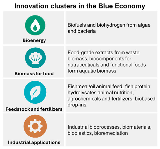Clusters of Blue biotechnological innovations identified by Pakseresht et al. [12]: (1) bioenergy from marine biomass, (2) biomass for food, (3) feedstock and fertilizers, and (4) industrial applications. These clusters reflect the valorization potential of marine-derived resources and their alignment with sustainable and circular business model patterns.