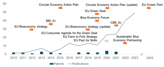 Number of scientific publications and patents related to marine-derived collagen and chitin/chitosan in Europe (1990–2023) Data adapted from [17]. European policy strategies directly or indirectly linked to the Blue bioeconomy.