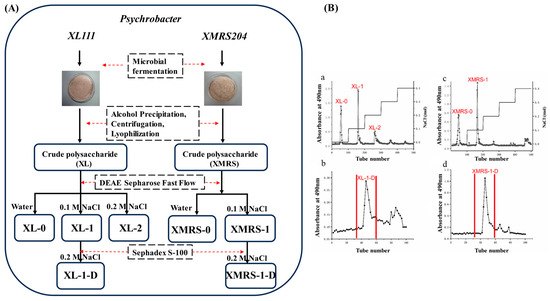 The extraction, purification and preparation flow chart for XL-1, XL-1-D, XMRS-1, and XMRS-1-D is shown in Figure 1A. After alcohol precipitation, centrifugation, lyophilization and protein removement, two crude fractions named XL and XMRS were obtained with yield of 624 mg/L and 1924 mg/L from strain XL111 and strain XMRS204, respectively. These two crude extracellular fractions were further purified by two-step chromatography. Firstly, two main fractions named XL-1 (42.1%) and XMRS-1 (13.3%) were purified from these two crude extracellular fractions by DEAE column separation, respectively. Subsequently, XL-1 and XMRS-1 were purified by Sephadex S-100 gel filtration chromatography to obtain single symmetrical peaks, named XL-1-D (37%) and XMRS-1-D (25%), respectively (Figure 1B).