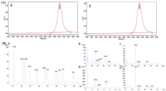 Results of molecular weight and monosaccharide composition of XL-1, XL-1-D, XMRS-1, and XMRS-1-D. (A) Molecular weight of XL-1-D and XMRS-1-D ((a) Molecular weight of XL-1-D; (b) Molecular weight of XMRS-1-D diagram); (B) Determination of monosaccharide composition of XL-1, XL-1-D, XMRS-1, and XMRS-1-D ((a): monosaccharide standards mixed label; (b): XL-1; (c): XL-1-D; (d): XMRS-1; (e): XMRS-1-D).