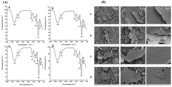 IR of XL-1, XL-1-D, XMRS-1, and XMRS-1-D. (A): Infrared spectra of four XL-1, XL-1-D, XMRS-1, and XMRS-1-D ((a): XL-1; (b): XL-1-D; (c): XMRS-1; (d): XMRS-1-D); (B): SEM of XL-1, XL-1-D, XMRS-1, and XMRS-1-D ((a): XL-1; (b): XL-1-D; (c): XMRS-1; (d): XMRS-1-D).