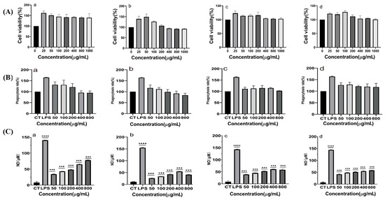 (A) Effects of different concentrations of XL-1, XL-1-D, XMRS-1, and XMRS-1-D on the viability of RAW264.7 cells ((a): XL-1; (b): XL-1-D; (c): XMRS-1; (d): XMRS-1-D); (B) Effects of different concentrations of XL-1, XL-1-D, XMRS-1, and XMRS-1-D on phagocytic activity of RAW264.7 cells ((a): XL-1; (b): XL-1-D; (c): XMRS-1; (d): XMRS-1-D); (C) Effects of different concentrations of XL-1, XL-1-D, XMRS-1, and XMRS-1-D on NO secretion in RAW264.7 cells ((a): XL-1; (b): XL-1-D; (c): XMRS-1; (d): XMRS-1-D). (All data are expressed as mean ± standard deviation (mean ± SD). Differences between groups and the blank control were analyzed using one-way analysis of variance (ANOVA). Significance levels were defined as follows: *** p < 0.001 (extremely significant), and **** p < 0.0001 (very highly significant)).