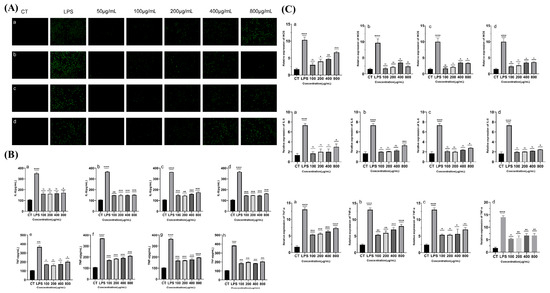 The experiment was divided into 5 groups: 1 blank group (containing culture medium only), 1 control group (containing 1 µg/mL LPS), and 5 experimental groups (containing 50 µg/mL, 100 µg/mL, 200 µg/mL, 400 µg/mL, and 800 µg/mL solution), with 3 replicates in each group. 1 × 104 cells were cultured in 100 μL complete culture medium per well of a 96-well plate. After 24 h of culture, the old culture medium was discarded, the plates were gently washed once with PBS, and then 0.01% neutral red solution at 37 °C was added for incubation for 2 h. The neutral red dye was then gently aspirated, the plates were washed three times with PBS, 200 lysis solution was added to each well and, after 2 h of incubation, the absorbance was measured at 450 nm using a multifunctional microplate reader.