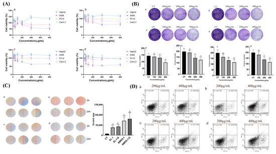 (A) Effects of different concentrations of XL-1, XL-1-D, XMRS-1, and XMRS-1-D on A549 cell viability ((a): XL-1; (b): XL-1-D; (c): XMRS-1; (d): XMRS-1-D); (B) Effects of different concentrations of XL-1, XL-1-D, XMRS-1, and XMRS-1-D on the colony formation of A549 cells ((a): XL-1; (b): XL-1-D; (c): XMRS-1; (d): XMRS-1-D); (C) Effects of 400 μg/mL XL-1, XL-1-D, XMRS-1, and XMRS-1-D of each component on the migration ability of A549 cells ((a): XL-1; (b): XL-1-D; (c): XMRS-1; (d): XMRS-1-D); (D): Effects of different concentrations of XL-1, XL-1-D, XMRS-1, and XMRS-1-D of A549 cells ((a): XL-1; (b): XL-1-D; (c): XMRS-1; (d): XMRS-1-D). (All data are expressed as mean ± standard deviation (mean ± SD). Differences between groups and the blank control were analyzed using one-way analysis of variance (ANOVA). Significance levels were defined as follows: * p < 0.05 (significant), ** p < 0.01 (highly significant)).