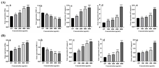 (A): Effects of different concentrations of XMRS-1 on the expression of apoptosis-related genes in A549 cells ((a): Bax; (b): BCL-2; (c): Caspase-3; (d): Caspase-8; (e): Caspase-9). (B): Effects of different concentrations of XMRS-1-D on the expression of apoptosis-related genes in A549 cells ((a): Bax; (b): BCL-2; (c): Caspase-3; (d): Caspase-8; (e): Caspase-9). (All data are expressed as mean ± standard deviation (mean ± SD). Differences between groups and the blank control were analyzed using one-way analysis of variance (ANOVA). Significance levels were defined as follows: * p < 0.05 (significant), ** p < 0.01 (highly significant), *** p < 0.001 (extremely significant), and **** p < 0.0001 (very highly significant)).