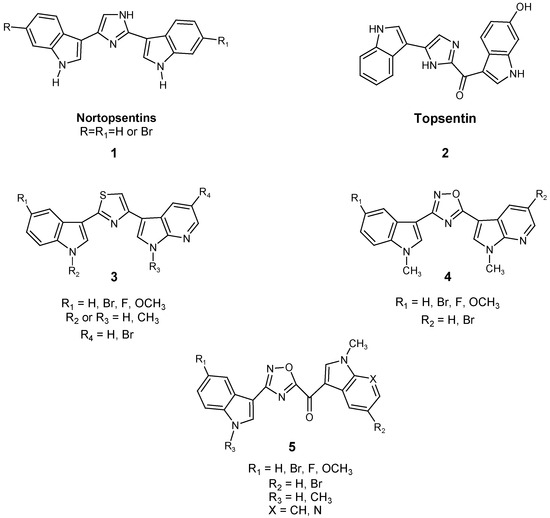 Chemical structures of nortopsentin 1 and topsentin 2 alkaloids and their derivatives 3–5.