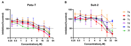 Effects of the most active compounds 7a–f on the viability of Patu-T (A) and Suit-2 (B) PDAC cell lines. Cells were treated with nine different concentrations of the compounds and cell survival was measured after 72 h by SRB assay in comparison to untreated control cells. Values are reported as the mean ± SEM of three separate experiments, performed in triplicate.