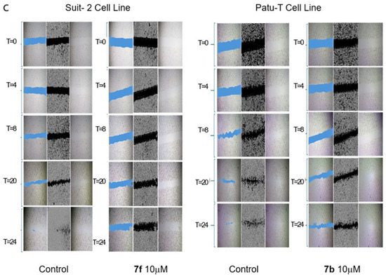 Cell migration was evaluated using a wound healing assay. A total of 5 × 104 cells per well for Patu-T and 6 × 104 cells per well for Suit-2 were seeded in 96-well plates and incubated overnight at 37 °C in a humidified atmosphere of 5% CO2 and 95% air to allow the formation of a confluent monolayer. Gaps (scratches) were introduced in the confluent monolayer using a scratch tool. Detached cells were removed by gentle washing, and fresh medium was added to the wells. Subsequently, the cells were treated with compounds 7b–f at a concentration of 10 µM.