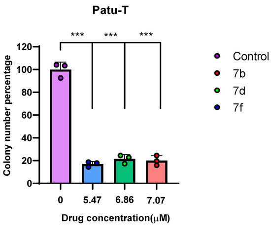 The results, illustrated in the bar graph in Figure 5, show the effects of compounds 7b, 7d, and 7f at their respective IC50 concentrations (7.07 µM for 7b, 6.86 µM for 7d, and 5.47 µM for 7f) on the colony-forming ability of the Patu-T cells compared to the untreated controls.