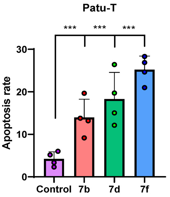Apoptosis rate induced by compounds 7b, 7d, and 7f in the Patu-T cell line compared to the untreated controls. p values were calculated with student’s t-test. *** p < 0.001.