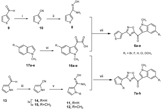 The carboxamidine intermediates 11 and 12 were prepared from commercial pyrrole-3-carboxaldehyde 13, which was dissolved in dry N-methyl pyrrolidone and reacted with NH2OH·HCl. The reaction, heated at 115 °C, allowed the synthesis of derivative 14 in a good yield (99%). The latter was converted into its methylated derivative 15, using sodium hydride as a base and iodomethane (CH3I) as a methylating agent. The cyano derivative 14 or the methyl derivative 15 were then dissolved in dry ethanol and reacted with sodium hydrogen carbonate and hydroxylamine hydrochloride (NH2OH·HCl), allowing the synthesis of derivatives 11 or 12, respectively, in good yields (95–96%).