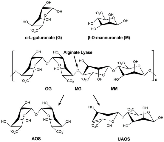 As a crucial nutrient for various marine heterotrophic bacteria, alginate, an anionic linear hetero-polysaccharide, consists of α-L-guluronate (G) and its C-5 epimer, β-D-mannuronate (M), linked through β-1,4-glycoside bonds [3]. These two monosaccharides are arranged as homopolymers, poly-α-L-guluronate (poly-G) and poly-β-D-mannuronate (poly-M), or a random heteropolymer (poly-MG) (Figure 1). As a natural biocompatible polysaccharide from brown algae, alginate is widely used in the food, agriculture, textile, and medical fields [4], and degradation by alginate lyases is one of the important processes in the ocean carbon cycle [5].