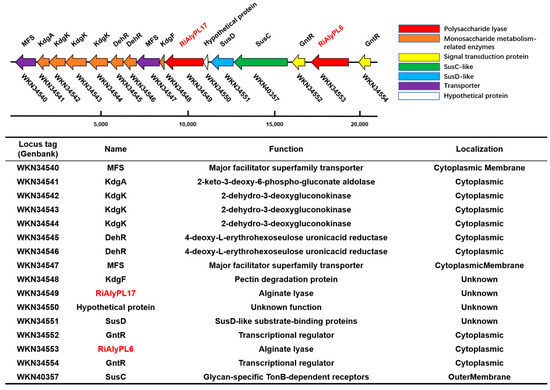 The assembled genome sequences weredeposited in the NCBI database (GenBank: CP120682) in previous studies. Initial functional annotation was conducted via the RAST (Rapid Annotation using Subsystem Technology) server (https://rast.nmpdr.org/, accessed on 28 January 2024) [20]. Pfam domains (http://pfam.xfam.org/, accessed on 15 February 2024) [21] and dbCAN3 (http://bcb.unl.edu/dbCAN2/, accessed on 27 February 2024) [22] were combined to identify potential CAZymes genes, and their functions were accurately predicted. Homologous protein sequences were identified via BLASTp searches against the NCBI database. Alginate utilization gene clusters were identified as potential Alginate-PUL. Alginate-utilizing genes, including CAZymes, sugar transporters, and transcriptional regulators, were located adjacent to alginate lyases, which extended the boundary of Alginate-PUL. To find Alginate-PUL, the genome sequences were also used to search and predict substrates using dbCAN CGCFinder [22].