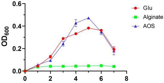 Growth cruves of Roseihalotalea indica gen. nov. sp. nov. TK19036T in the medium with glucose, sodium alginate, or AOS as the sole carbon source.