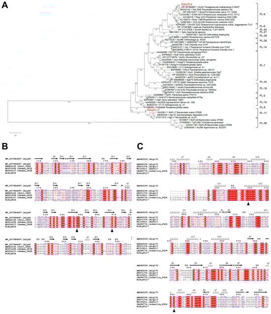 Sequence analysis of the alginate lyases RiAlyPL6 and RiAlyPL17. (A) Phylogenetic analysis of RiAlyPL6, RiAlyPL17, and other alginate lyases from different families. (B) Comparison of the amino acid sequences of RiAlyPL6 with PL6 alginate lyases. (C) Comparison of the amino acid sequences of RiAlyPL6 with PL17 alginate lyases.