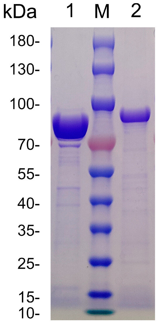 Chemically competent E.coli BL21 (DE3) cells were transformed with recombinant plasmids and propagated in LB medium containing 30 μg·mL−1 kanamycin sulfate at 37 °C. Protein expression was induced at an optical density of 0.5 at 600 nm (OD600) with 0.02 mmol·L−1 isopropyl β-D-1-thiogalactopyranoside (IPTG), followed by incubation at 18 °C for 24 h under shaking conditions at 200 rpm. The proteins were purified via the HisTrapTM HP column (Cytiva, Uppsala, Sweden). Subsequently, 12.5% SDS-PAGE was used to assess the purity and Mw of the proteins, and their concentrations were measured using a bicinchoninic acid (BCA) assay (New Cell & Molecular Biotech Co., Ltd., Suzhou, China).