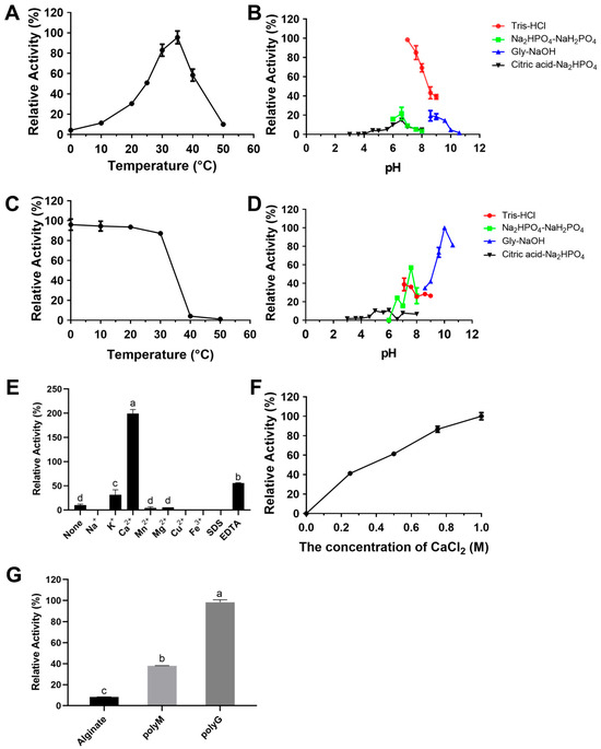 Biochemical characterization of RiAlyPL6. Optimal temperature (A), optimal pH (B), thermal stability (C), pH stability (D), effect of metal ions (E), effect of CaCl2 concentration (F), and substrate specificity (G) of RiAlyPL6. Values represent the mean of three replicates ± standard deviation, and different letters indicate significant differences at p < 0.05 between groups.
