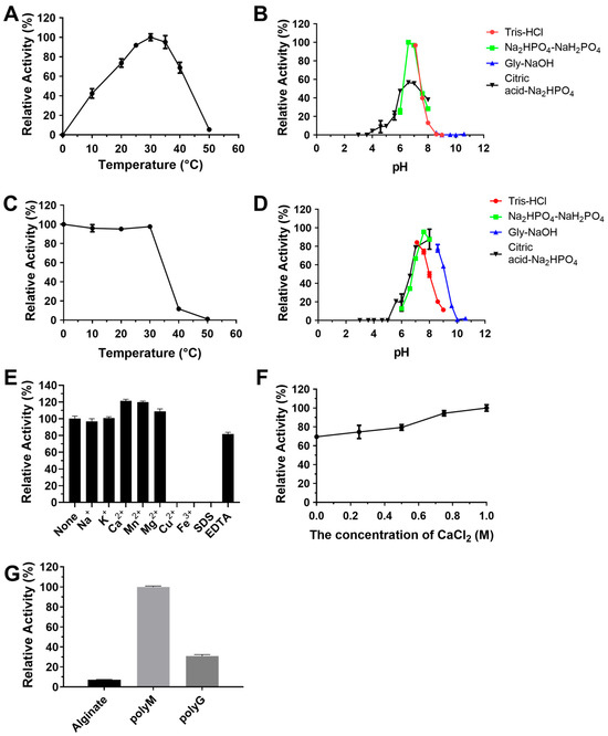 In addition, the optimal temperature and optimal pH of RiAlyPL17 were 30 °C and 6.6, respectively (Figure 7A,B). The stability of RiAlyPL17 was retained over 80% of its peak activity when incubated at 0–30 °C for 1 h or within a pH range of 7.0–7.6 for 12 h (Figure 7C,D). The activity of RiAlyPL17 was significantly increased by Ca2+, Mg2+, and Mn2+ (Figure 7E). The effect of CaCl2 concentrations on activity was investigated. RiAlyPL17 maintained above 70% activity from 0–1.0 M CaCl2 and showed the highest activity at 1.0 M (Figure 7F). Regarding substrate specificity, RiAlyPL17 demonstrated high substrate specificity for poly-M and low activity for alginate (7.00 ± 0.45%) and poly-G (30.74 ± 1.58%) (Figure 7G).