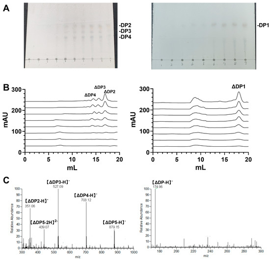 Thin-layer chromatography (TLC) and AKTA FPLC chromatography systems (Cytiva) were employed to assess the mode of action. Briefly, a mixture of 10 mL 0.3% (w/v) standard sodium alginate and 1 mL of RiAlyPL6 or RiAlyPL17 (0.2 U) was incubated under optimized conditions of 1, 5, 10, 20, 30, or 1, 30, 60, 90, 120 min. Degradation products were analyzed using silica gel plates (TLC Silica gel 60 F254, Merck, Beijing, China) and a mobile phase composed of 1-butanol:formic acid:water (4:6:1, v/v/v) [19]. Plates were stained with diphenylamine-aniline-phosphate (DPA) reagent and charred at 130 °C to visualize carbohydrate bands. Size-exclusion chromatography (SEC) analysis was performed using a Superdex 30 Increase 10/300 GL column (Cytiva, Marlborough, MA, USA). Elution profiles were monitored at 235 nm using an AKTA Purifier system (Cytiva) [30]. For mass spectrometric characterization, reaction mixtures were desalted and analyzed using negative-ion electrospray ionization mass spectrometry (ESI-MS) [31].
