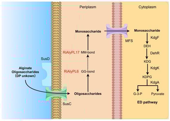 - With the help of the SusC/SusD-like transporter, which is located on the outer membrane and delivered into the periplasm, the produced AOS from other microorganisms is converted into monomers via Oals, RiAlyPL6, and RiAlyPL17, regardless of the M/G ratio. RiAlyPL6 cleaves the GG blocks first via an endo-mode, and then RiAlyPL17 cuts on the MM blocks via an exo-mode, while the MG blocks may be degraded relatively slowly.