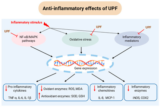 Several in vitro studies have indicated that UPF effectively inhibits the nuclear factor kappa B (NF-κB) and mitogen-activated protein kinase (MAPK) signalling pathways, suppresses oxidative stress, and reduces the expression of pro-inflammatory mediators, thereby mitigating diverse inflammation-related responses (Figure 1).