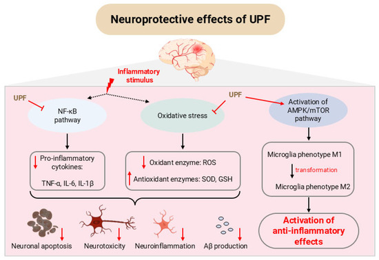 The scientific literature has reported an increasing number of studies highlighting the neuroprotective effects of UPF in promoting brain health and mitigating the progression of neurodegenerative diseases such as Alzheimer’s (AD). These effects arise from multifactorial interplay involving anti-inflammatory [22], anti-apoptotic [84], antiviral [26], and antioxidant activities [85] of UPF. Findings from both in vitro and in vivo investigations demonstrate that UPF can attenuate neuronal apoptosis, inhibit amyloid-β (Aβ) aggregation, and suppress the activation of microglia and astrocytes by reducing oxidative stress and neuroinflammation across various experimental models of neurodegenerative conditions [22,26].