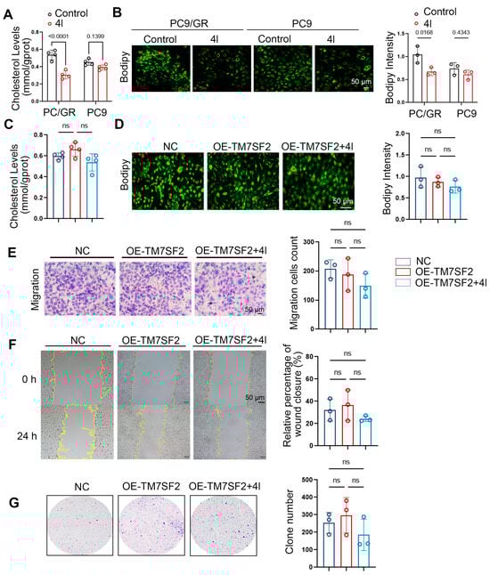 To investigate the relationship between intracellular cholesterol levels and gefitinib resistance, we measured cholesterol content in PC9 (gefitinib-sensitive) and PC9/GR (gefitinib-resistant) cells. Cholesterol quantification assays revealed significantly higher intracellular cholesterol levels in PC9/GR cells compared to PC9 cells. Treatment with compound 4l reduced intracellular cholesterol levels in PC9/GR cells but had no significant effect on PC9 cells (Figure 5A). Furthermore, BODIPY 493/503 staining of lipid droplets (LDs) demonstrated increased LD accumulation in PC9/GR cells relative to PC9 cells. Compound 4l treatment significantly inhibited this lipid accumulation in gefitinib-resistant PC9/GR cells (Figure 5B). To further elucidate the role of TM7SF2 in mediating the cholesterol-lowering effects of compound 4l in PC9/GR cells, we generated a TM7SF2-overexpressing PC9/GR cell line via plasmid transfection. Results demonstrated that TM7SF2 overexpression abrogated the reduction in intracellular cholesterol levels induced by compound 4l in PC9/GR cells (Figure 5C,D). Furthermore, TM7SF2 overexpression attenuated the inhibitory effects of compound 4l on the migration, proliferation, and invasion of PC9/GR cells (Figure 5E–G). Collectively, these data indicate that compound 4l primarily suppresses the malignant phenotype of gefitinib-resistant cells by inhibiting TM7SF2 expression.