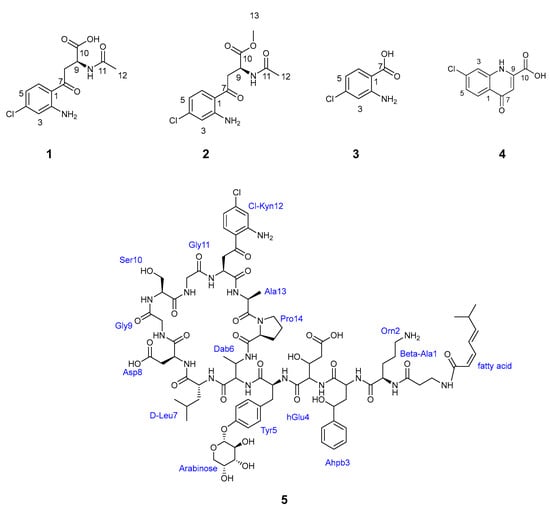 - Alferova, V.A.; Shuvalov, M.V.; Suchkova, T.A.; Proskurin, G.V.; Aparin, I.O.; Rogozhin, E.A.; Novikov, R.A.; Solyev, P.N.; Chistov, A.A.; Ustinov, A.V.; et al. 4-Chloro-l-Kynurenine as Fluorescent Amino Acid in Natural Peptides. Amino Acids 2018, 50, 1697–1705. [Google Scholar] [CrossRef]