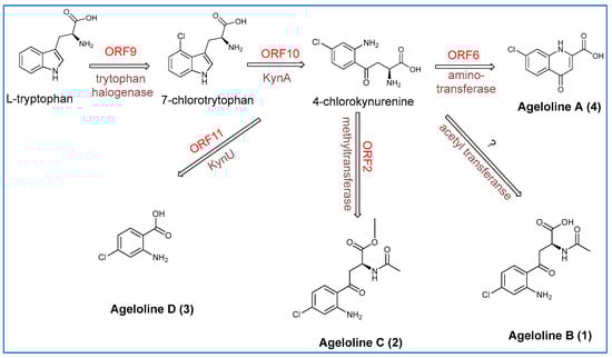 2.6. The Proposed Biosynthesis of Ageloline A-D (1–4)